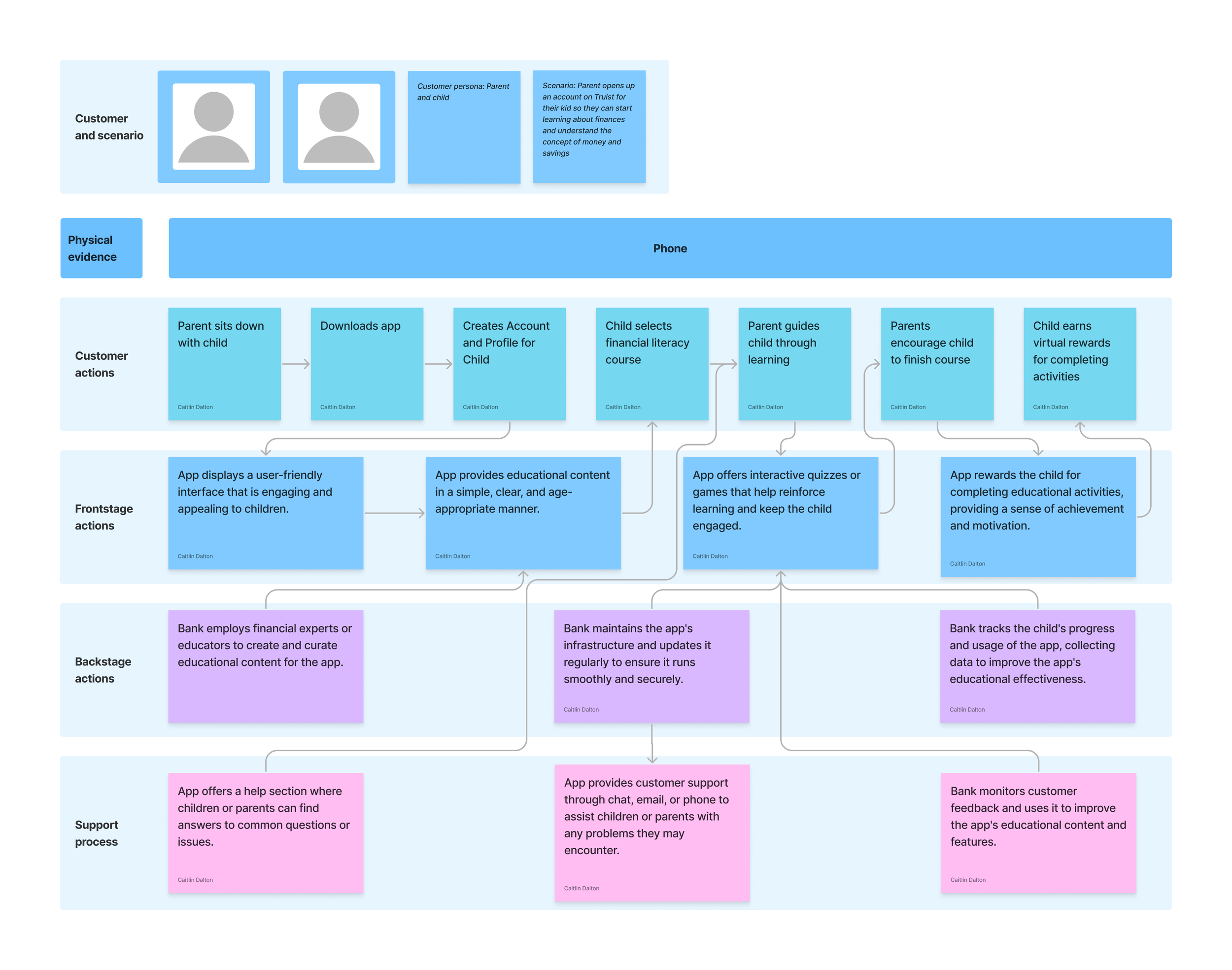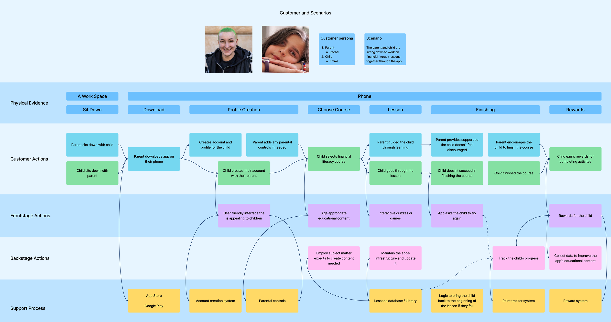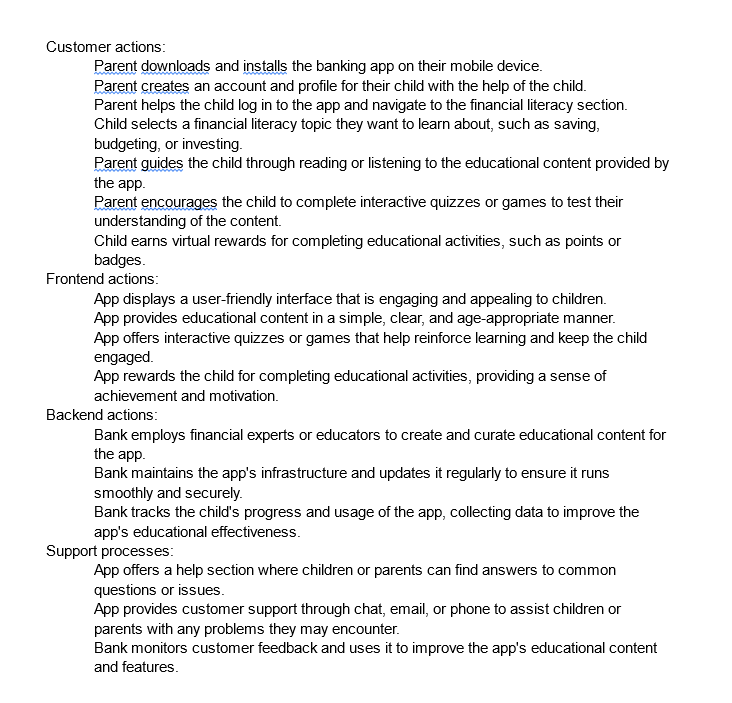 What we ended up with was an app that contained lessons that the parent and child would take together and by completing lessons the child would earn rewards. With our feature in place we went on to just create a list of customer, front-end, back-end, and support actions that we thought would be needed in order for this service to be viable.